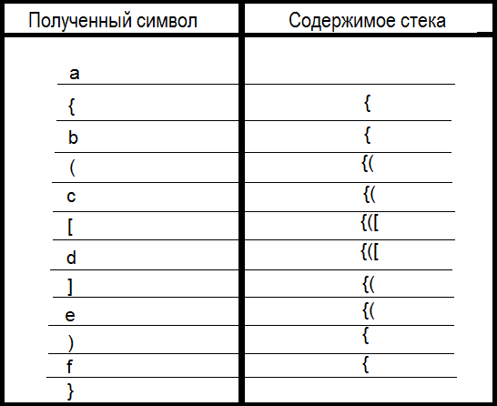 Рассмотрим состояние стека при разборе строки a {b (c [d] e) f}